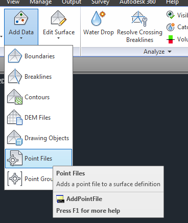 Langsung saja. Setelah data pengukuran topografi berhasil diimport, langkah yang perlu kita lakukan adalah dengan pergi ke menu Home–Surfaces seperti pada tampilan berikut