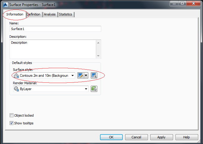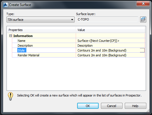 Kemudian pada menu properties kita akan diminta untuk mengisikan nama dari surface berikut style dari kontur yang akan kita tampilkan nanti. Untuk latihan kali ini silakan biarkan dalam kondisi defaultnya. Kemudian klik OK